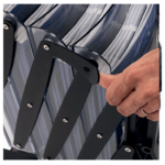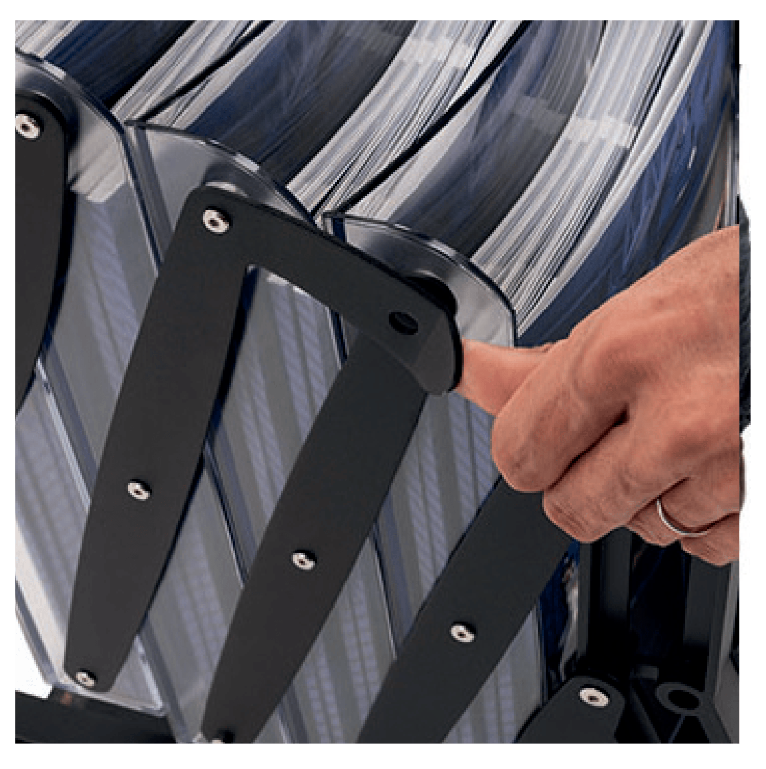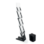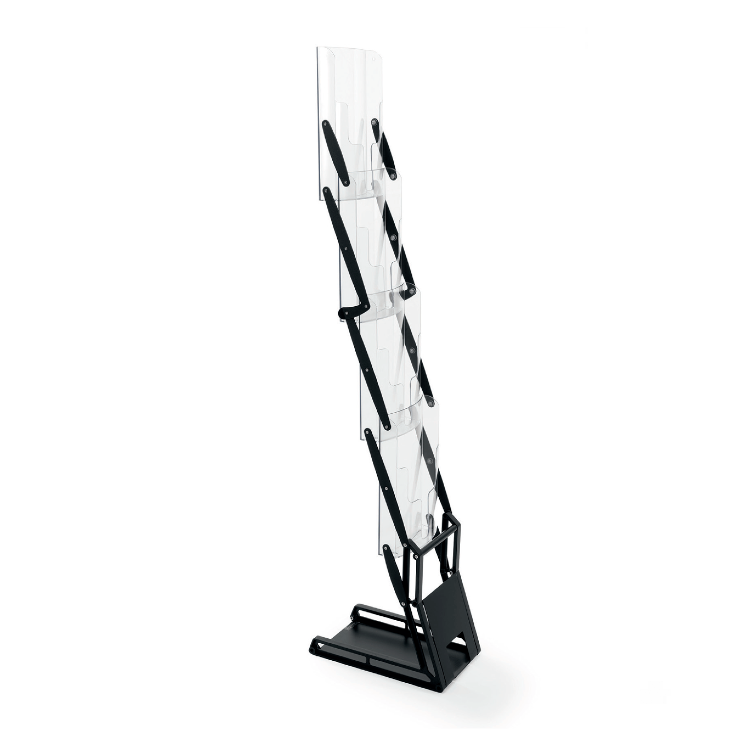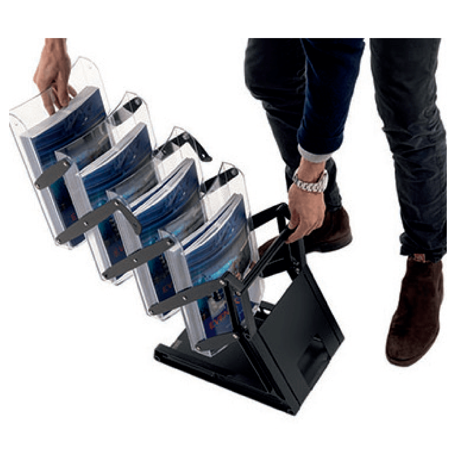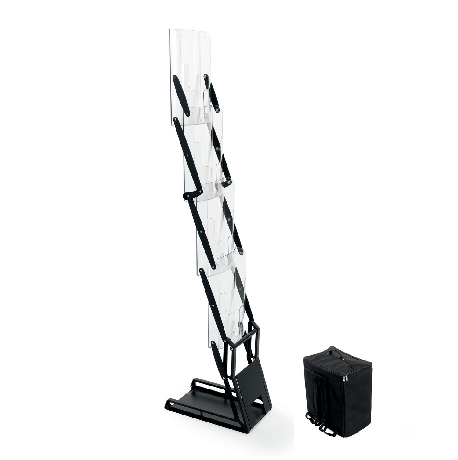 Brochureholder Pro – Enkelsidigt broschyrställ av hög kvalitet med extra tåliga förvaringsfack i polykarbonat. Fot och ställning med handtag i svartlackerad plåt. Komplett med vadderad väska som har bärhandtag och axelrem. Låt katalogerna/broschyrena sitta kvar fakcken när den fälls ihop. En kvalitetsprodukt från Spennare.