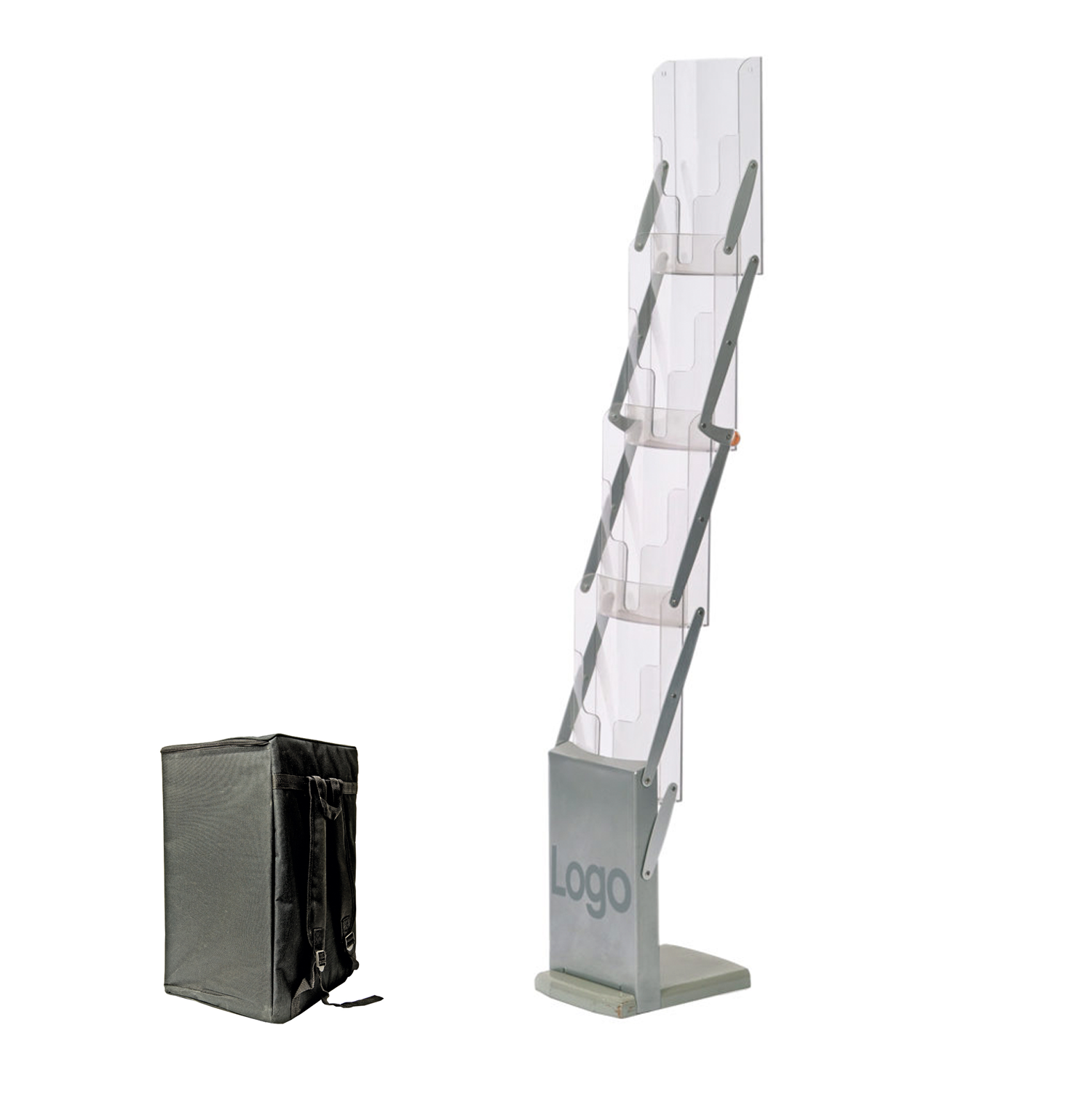 Stabil väska medföljer för att lätt kunna flytta med broschyrstället. Kan fällas ihop med broschyrer kvar i facken. 4 st A4 fack. Önskar du din logotyp på ställets fot? Ladda upp din logga här via vår filuppladdning, antingen innan eller efter din beställning.