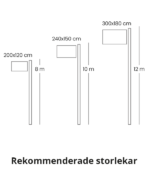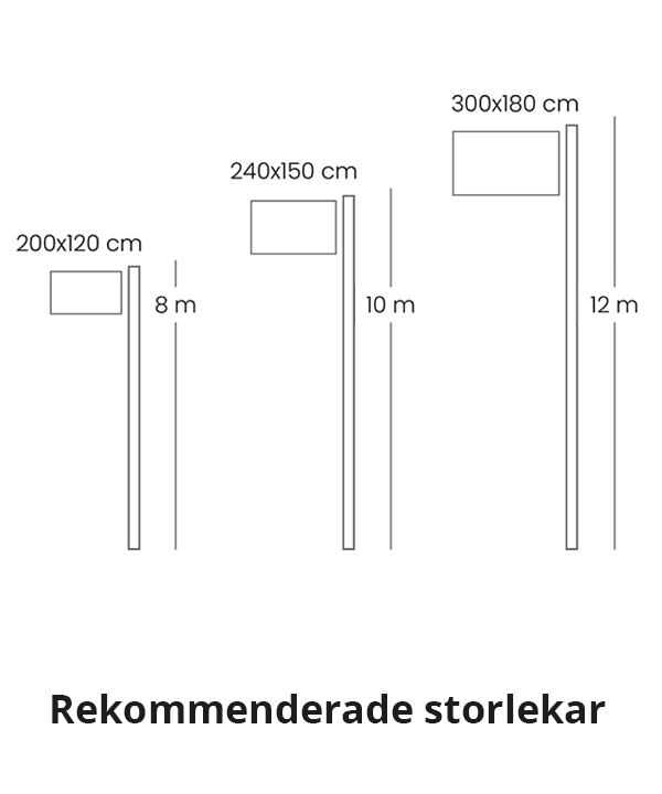 En lista på rekommenderade storlekar för flaggstång och flaggor: