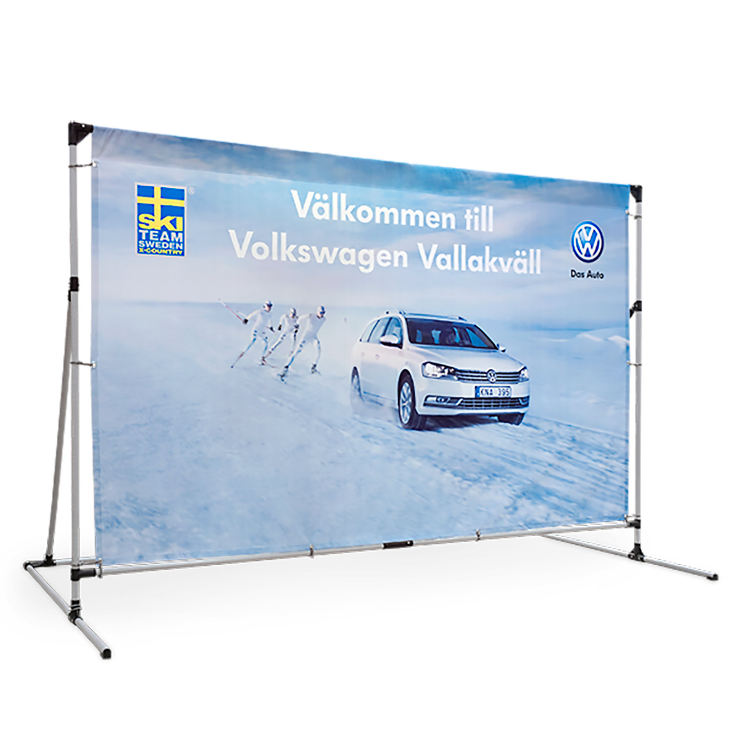 En portabel och fristående eventvägg för exponering utomhus. Tåliga glasfiberrör monteras snabbt samman till en fristående eventvägg, inga verktyg behövs. Ställningen har inbyggda vikter för optimal grundstabilitet. Som tillbehör finns markspik och sandsäckar för extra fäste. Systemet levereras komplett tillsammans med en avlång väska. Eventväggen finns i tre olika storlekar och eftersom bildvåden är separat kan denna beställas separat så att ställningen kan användas om och om i många år tillsammans med många olika budskap.