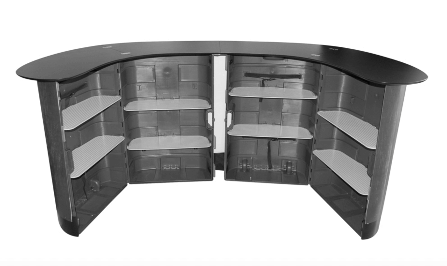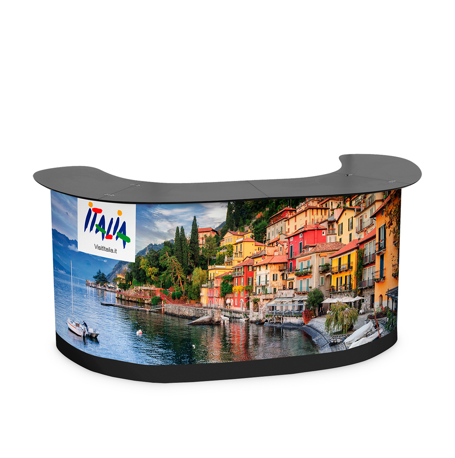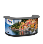 Podium XL är en riktigt stor monter eller bardisk för dig som vill skapa personlig kontakt med dina besökare på mässan. Disken består av två boxar som även kan användas för transport av ditt övriga mässmaterial. Disken kommer komplett med ditt eget budskap på framsidan, hyllplan på insidan samt svart toppskiva.