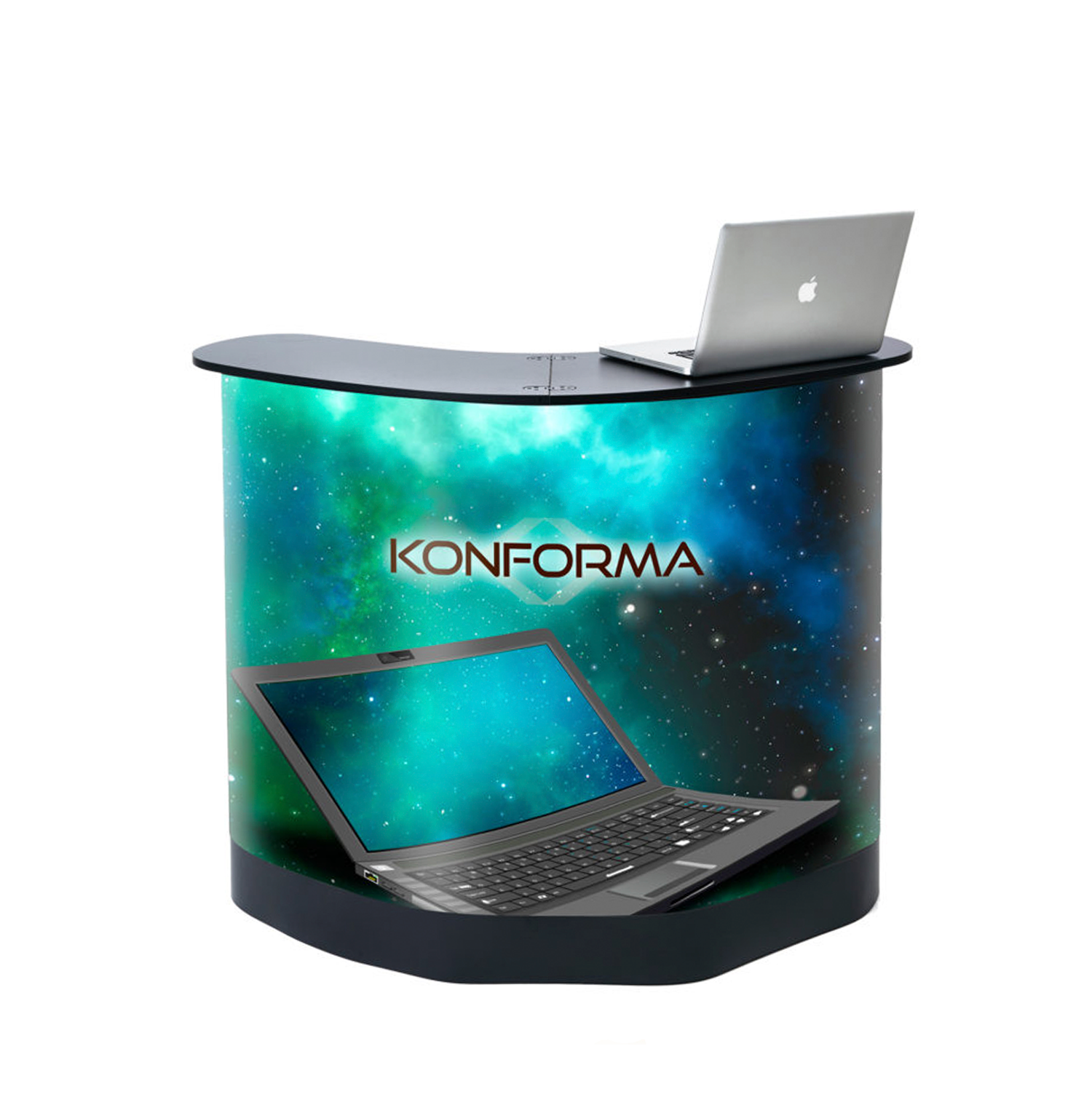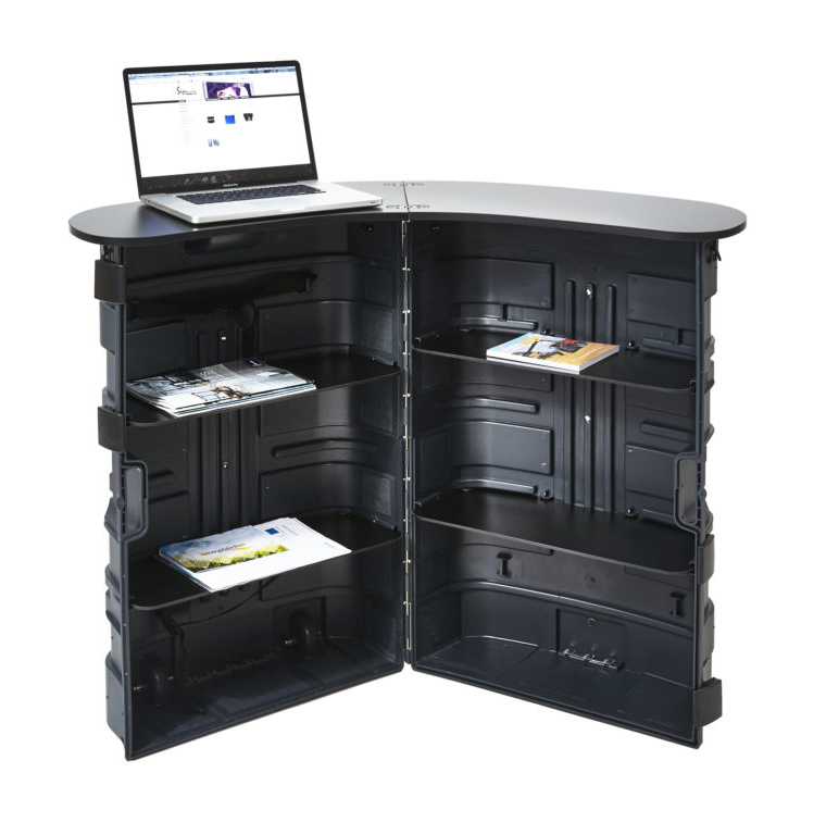 Mässdisk och transportbox i ett! Podiumdisk som tål tuffa tag och som är enkel att transportera med de inbyggda hjulen. Enkelt montage av bildvåd med hjälp av medföljande kardborrefästen. Mässdisken levereras komplett med ditt bildbudskap, svart toppskiva och 4 stycken hyllplan. När du inte använder disken har du en stor och tålig transportväska på hjul som har plats för massor av mässmaterial.