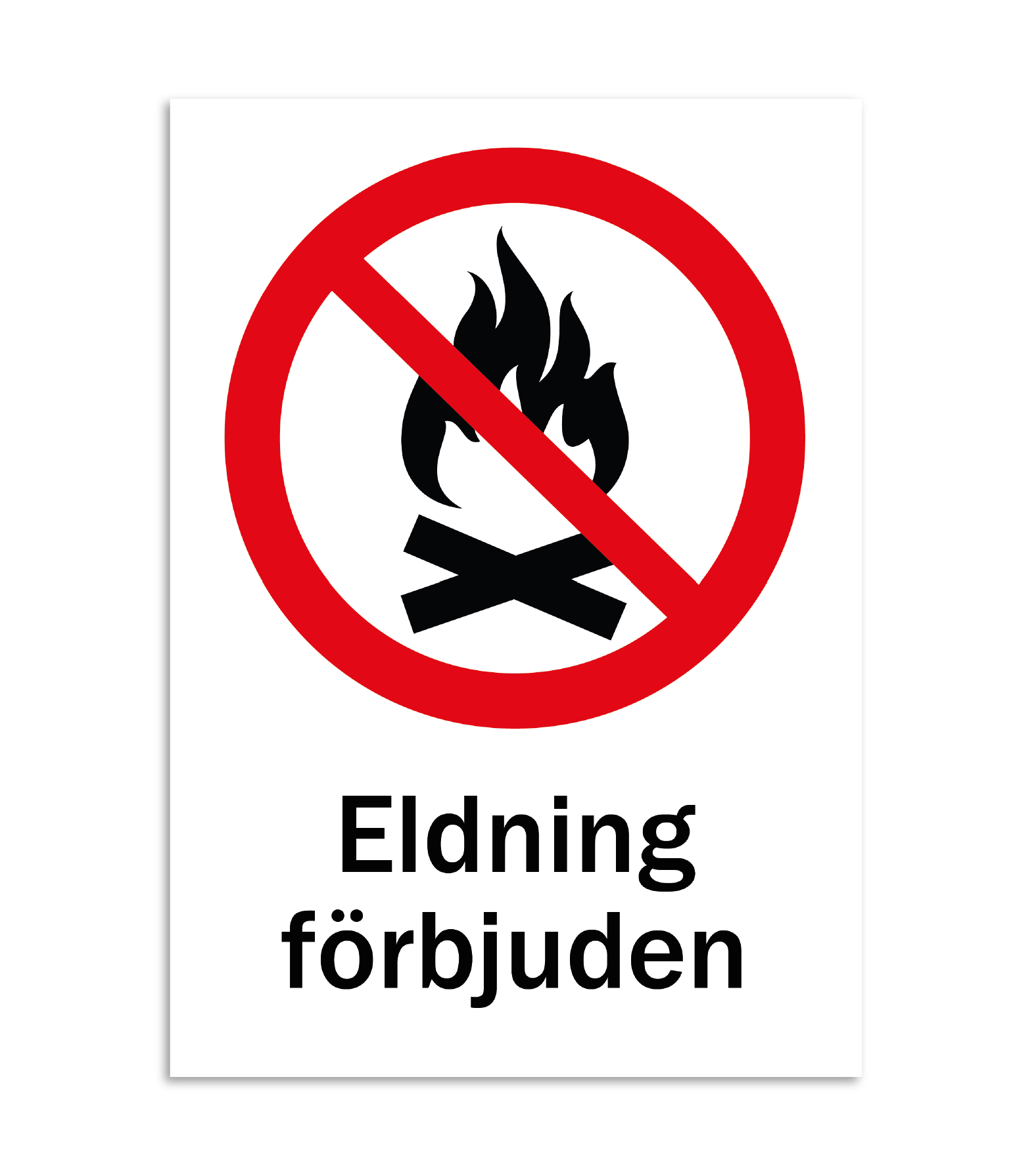 Förbudsskylt med texten Eldning förbjuden. Skylten finns i två storlekar, A4 eller A3 och ni kan välja mellan materialen Aluminium eller Homogen plast (inkl. skyddslaminat). Homogen plast är en kvalitativ plast och håller ofta bra mot yttre påverkan. Skall skylten monteras på stolpe rekommenderar vi att ni väljer kantvikt Aluminium och SH-klammer som tillval. Annars kan du välja mellan förborrade hål eller dubbelhäftande tejp på baksidan.
