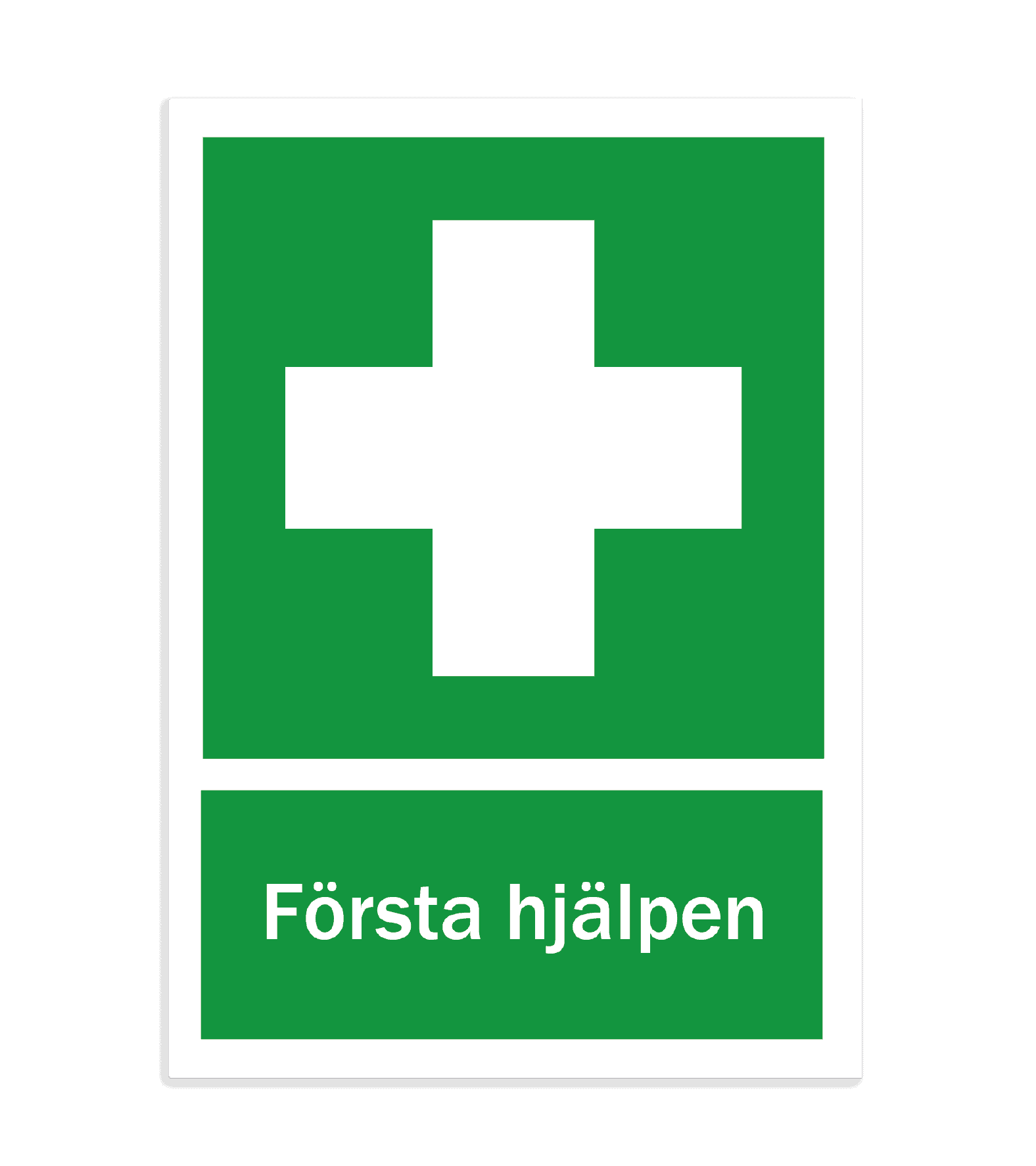 Skylt med texten Första hjälpen. Skylten finns i två storlekar, A4 eller A3 och ni kan välja mellan materialen Aluminium eller Homogen plast (inkl. skyddslaminat). Homogen plast är en kvalitativ plast och håller ofta bra mot yttre påverkan. Skall skylten monteras på stolpe rekommenderar vi att ni väljer kantvikt Aluminium och SH-klammer som tillval. Annars kan du välja mellan förborrade hål eller dubbelhäftande tejp på baksidan.