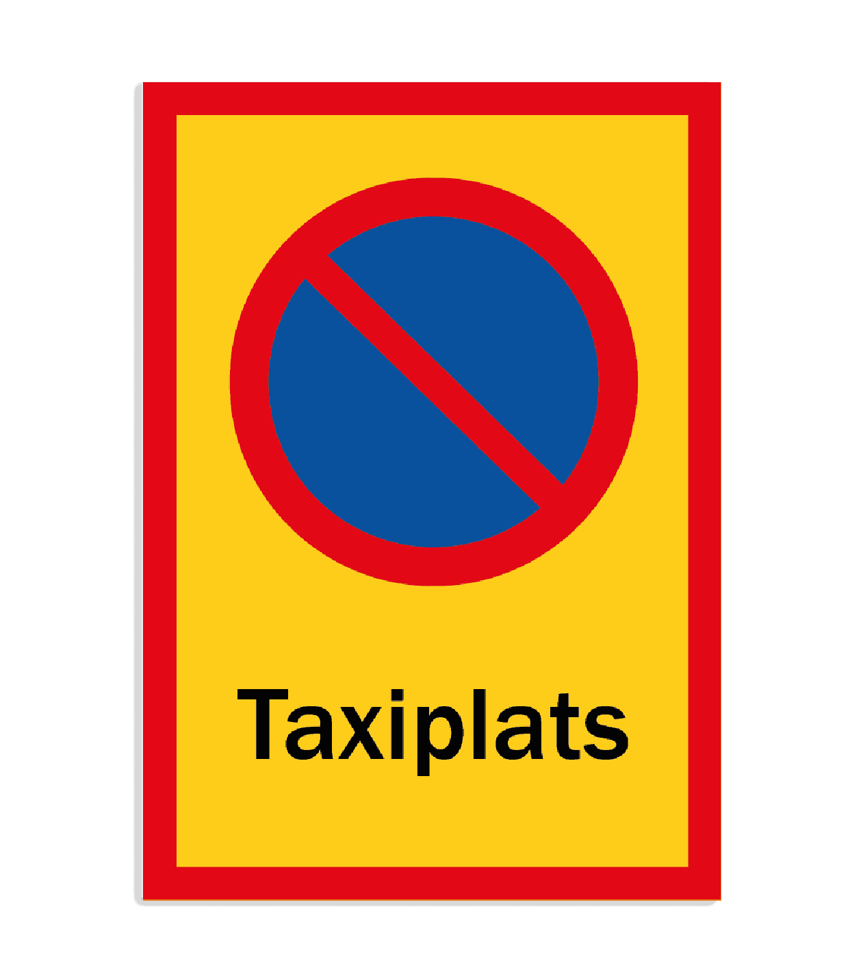 Förbjuden parkering med texten Taxiplats. Skylten finns i två storlekar, A4 eller A3 och ni kan välja mellan materialen Aluminium eller Homogen plast (inkl. skyddslaminat). Homogen plast är en kvalitativ plast och håller ofta bra mot yttre påverkan. Skall skylten monteras på stolpe rekommenderar vi att ni väljer kantvikt Aluminium och SH-klammer som tillval. Annars kan du välja mellan förborrade hål eller dubbelhäftande tejp på baksidan.