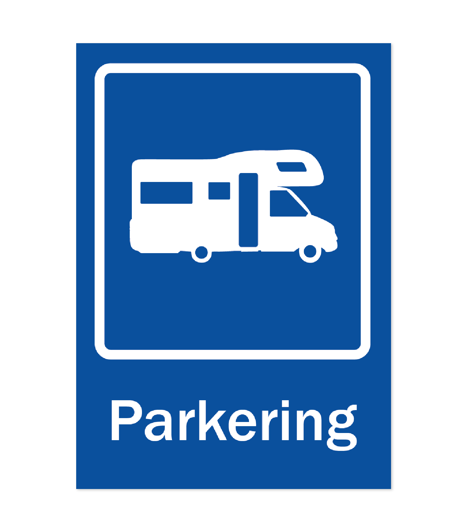 Parkeringsskylt Husbil. Skylten finns i två storlekar, A4 eller A3 och ni kan välja mellan materialen Aluminium eller Homogen plast (inkl. skyddslaminat). Homogen plast är en kvalitativ plast och håller ofta bra mot yttre påverkan. Skall skylten monteras på stolpe rekommenderar vi att ni väljer kantvikt Aluminium och SH-klammer som tillval. Annars kan du välja mellan förborrade hål eller dubbelhäftande tejp på baksidan.