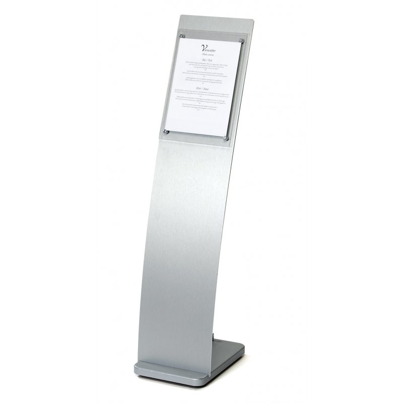 Skyltstället Vista är ett exklusivt informationsställ med ett exklusivt och minimalistiskt intryck. Fronten till stället är tillverkad av eloxerad aluminiumplåt, 25 mm, samt informationsyta av 3 mm akrylfront med plats för A4-information. Fronten är monterad på stilrena kromade skyltdistanser. Fot tillverkad av silverfärgad MDF.