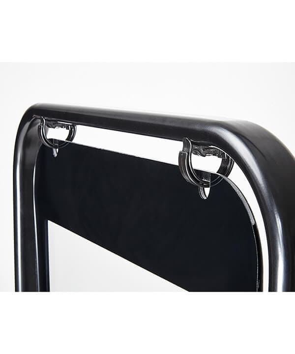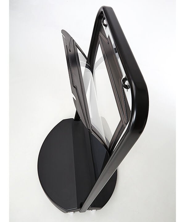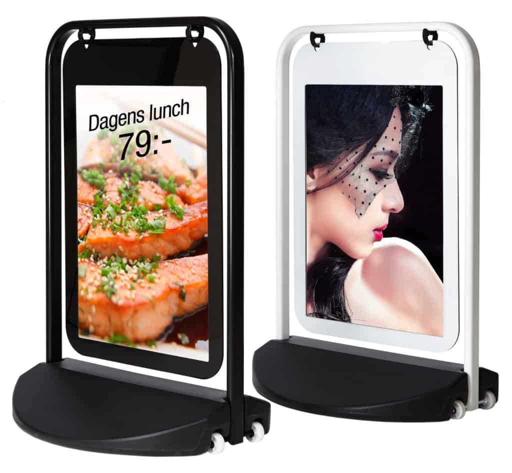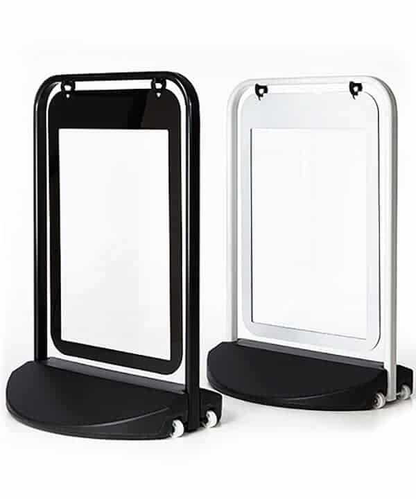 Inbyggda hjul i foten gör det lätt flytta ut och in skylten varje dag. Foten fylls med vatten eller sand för att göra den tyngre och därmed bättre stabilitet.